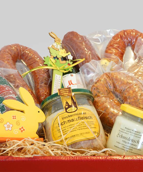 Hier erhalten Sie unsere besonderen Spezialitäten in einem großen Osterpaket mit netter Osterdeko. Eine tolle Geschenkidee zu Ostern, aber auch für Geburtstage, Jubiläen oder Firmenfeiern. Ideal um sich von unseren reichhaltigen Produkten einen Eindruck zu verschaffen. Hier wird die ganze Familie satt. Worauf warten Sie noch – schlagen Sie zu!