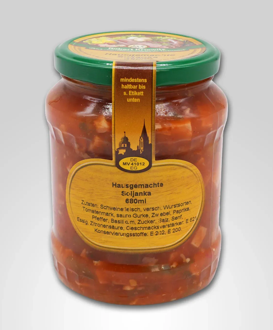 Bei Robert Kriewitz wird die hausgemachte Soljanka nach traditioneller Art zubereitet – mit einer fein abgestimmten Gewürzkomposition, die für den typischen, herzhaft-säuerlichen Geschmack sorgt. In unserer Soljanka stecken beste Zutaten wie Schweinefleisch, Wurstabschnitte, Paprika, Tomatenmark, saure Gurken und Zwiebeln. Für die Würze sorgen edelsüßes Paprikapulver, Pfeffer, Basilikum, eine ausgewogene Prise Zucker, etwas Essig für die feine Säure, Salz und Senf. Diese Kombination verleiht der Soljanka ihren charakteristischen Geschmack – würzig, leicht pikant und angenehm säuerlich.