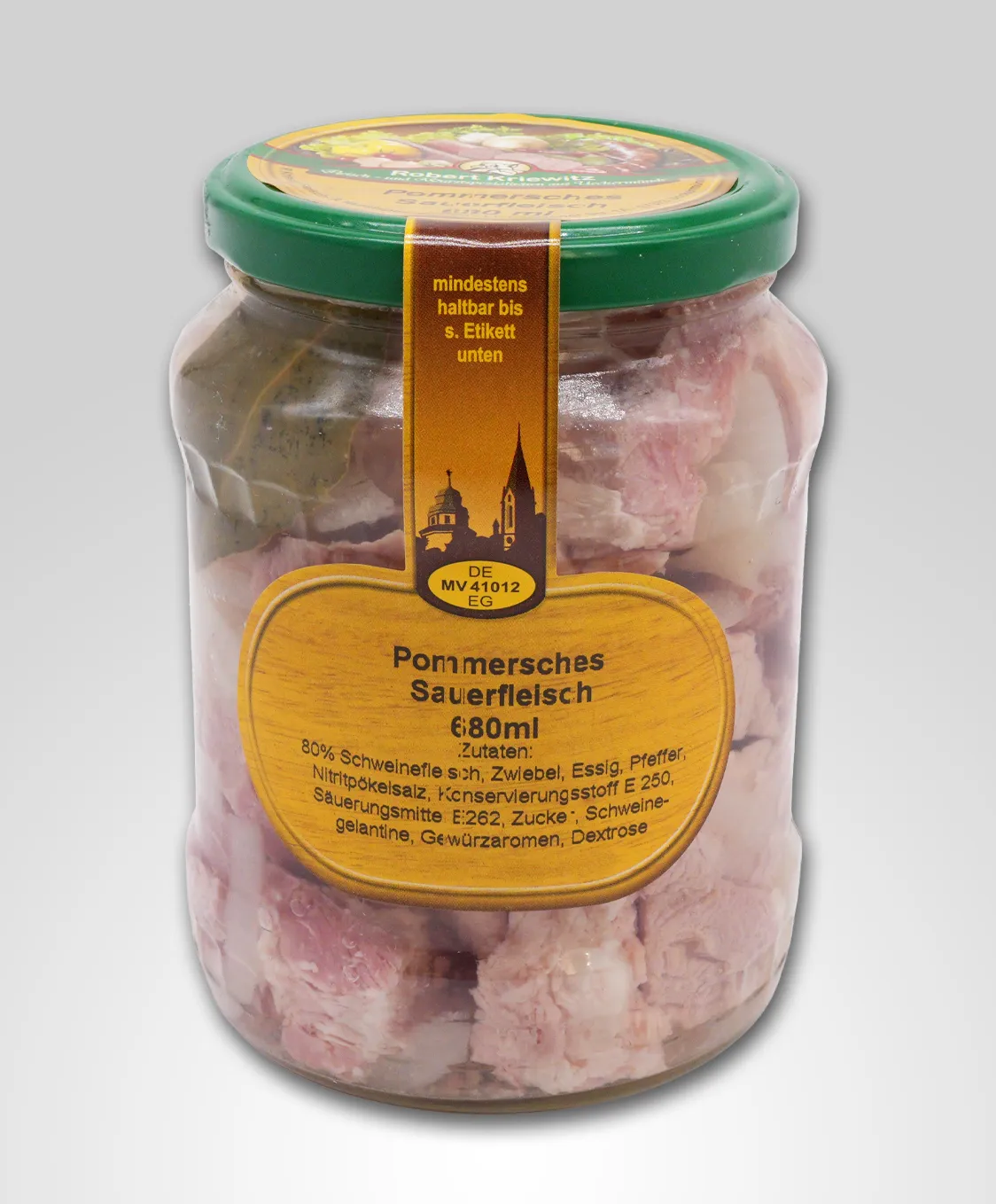 In unserer Hausmetzgerei wird das Fleisch, welches von „glücklichen“ Schweinen und keiner Massentierhaltung stammt, aus dem Schinken geschnitten und mit besonderen Gewürzen in Aspik eingelegt. Sie brauchen auch gar keine Küchenfee sein um unser pommersches Sauerfleisch zu kredenzen, denn es wird kalt gegessen. Deshalb ist das eingelegte Fleisch übrigens auch ein tolles Essen an heißen Sommertagen. Sie können es direkt aus dem Einmachglas nehmen, in mundgerechte Stücke schneiden und mit Bratkartoffeln oder Salat und würziger Remouladensauce servieren. Genießen Sie ein kühles Bier dazu! Schließlich lebt man nur einmal.