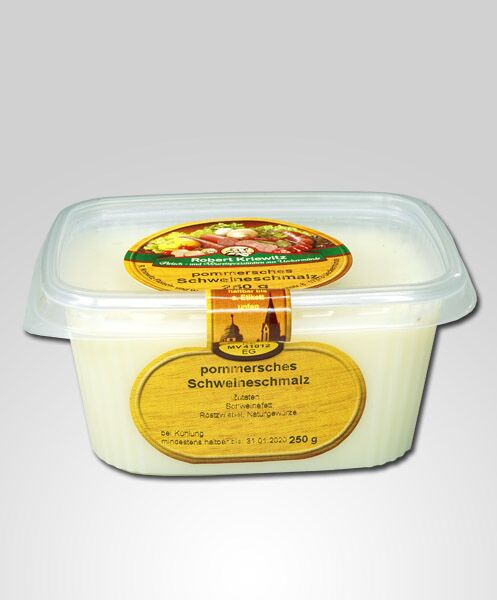 Unser uriges Pommersches Schweineschmalz im Becher nennen wir auch Schwedenschatz, denn es ist so simpel wie genial. Unser Schmalz wird für Sie aus reinem natürlichem Schweinespeck gewonnen. Wir verfeinern es lediglich mit leckeren Röstzwiebeln und geben einige geheime Naturgewürze dazu. Auf frischem Brot oder zum braten ist das Schmalz ein absoluter Leckerbissen. Sie können das Glas anschließend wiederverwenden. Ein kleiner Schatz eben.