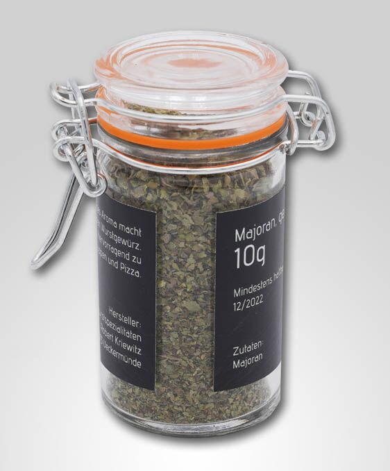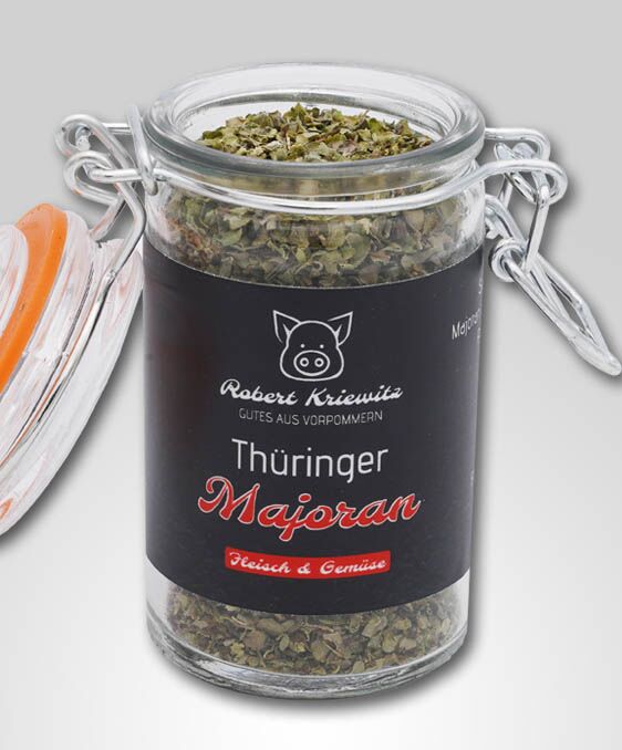 Unser gerebelter Majoran aus Thüringen besticht durch sein leicht herbes aber angenehm würziges Aroma. Es ist das Gewürz, dass viele unserer Würste verfeinert und Sie holen sich damit ein Stück Kriewitz-Geschmack nach Hause. Seine leichte Schärfe macht den Majoran auch für Bratwürte unablässig. Aber viele weitere Gerichte wie Suppen oder Beilagen erhalten durch Majoran den letzten Schliff. Es ist auch ein signifikantes Pizzagewürz. Im schönen Bügelglas bleibt der Majoran lange frisch und ist eine tolle Dekoration auf dem Gewürzregal.