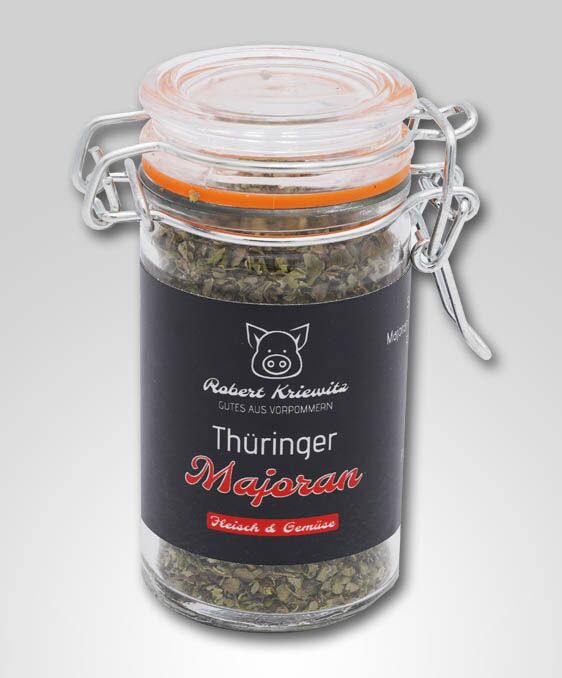 Unser gerebelter Majoran aus Thüringen besticht durch sein leicht herbes aber angenehm würziges Aroma. Es ist das Gewürz, dass viele unserer Würste verfeinert und Sie holen sich damit ein Stück Kriewitz-Geschmack nach Hause. Seine leichte Schärfe macht den Majoran auch für Bratwürte unablässig. Aber viele weitere Gerichte wie Suppen oder Beilagen erhalten durch Majoran den letzten Schliff. Es ist auch ein signifikantes Pizzagewürz. Im schönen Bügelglas bleibt der Majoran lange frisch und ist eine tolle Dekoration auf dem Gewürzregal.