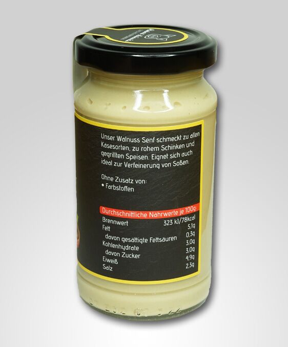 Der Ueckermünder Walnuss Senf ist ein mittelscharfer Senf mit Walnussaroma. Unser Walnuss Senf schmeckt zu allen Käsesorten, zu rohem Schinken und gegrillten Speisen. Eignet sich auch ideal zur Verfeinerung von Soßen.